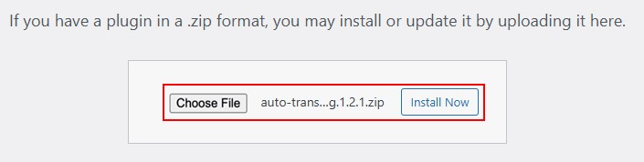 - Click Choose File and select the downloaded auto-translator-polylang.x.x.x.zip file.