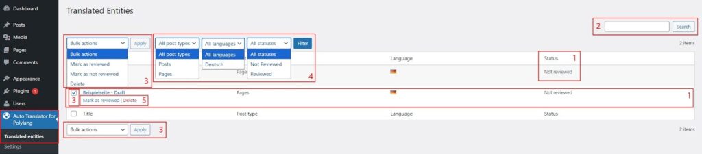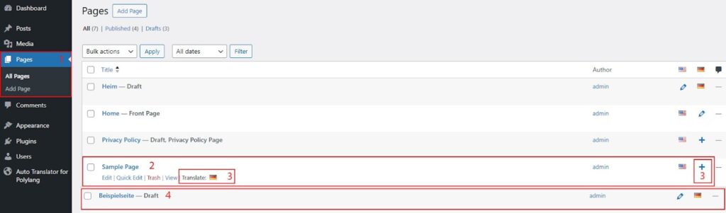4. Filter translated pages by post type, language, and status.