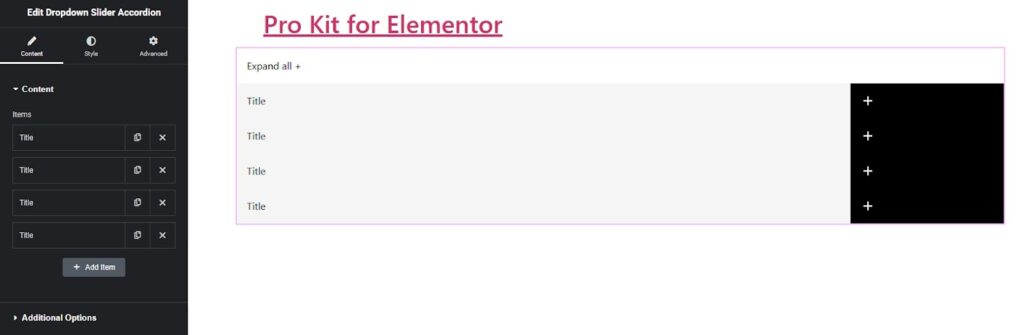 To add a new tab to the widget, click the widget on the page, go to the Content tab, and click the Add Item button.