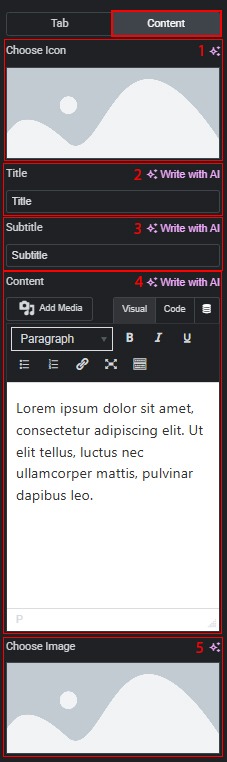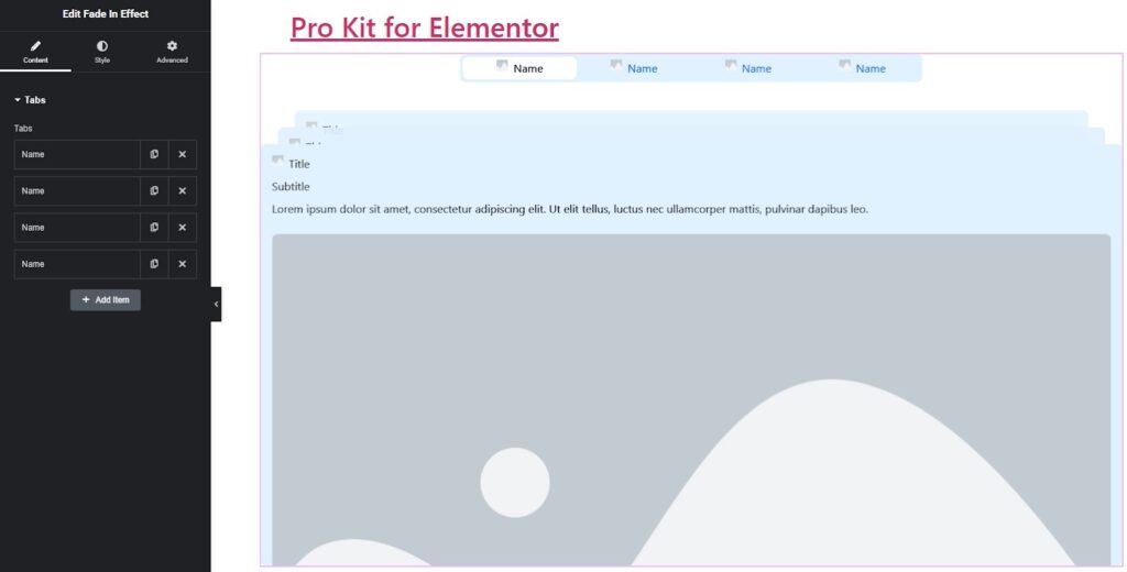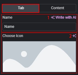To add a new tab to the widget, click the widget on the page, go to the Content tab, and click the Add Item button.