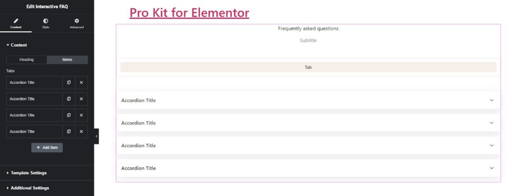 To add a new tab to the widget, click the widget on the page, go to the Content tab, and click the Add Item button.