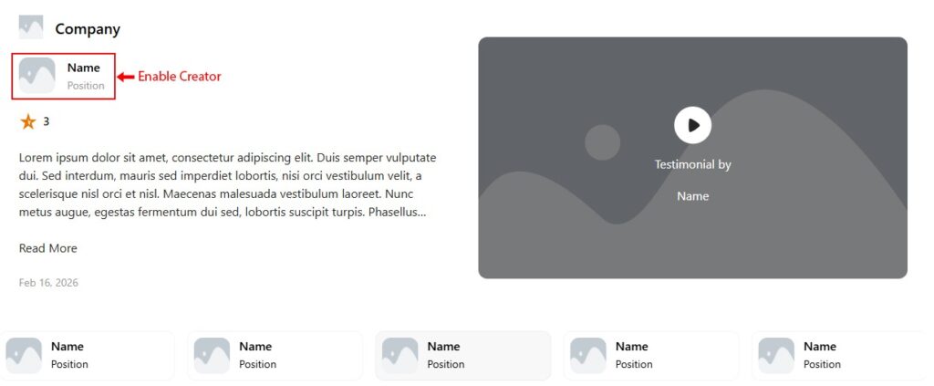 - Enable Creator — displays the creator’s avatar, name, and position.