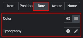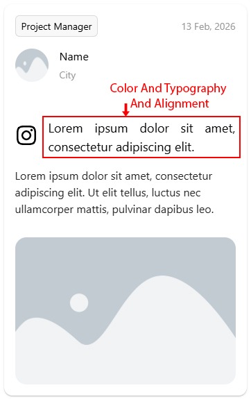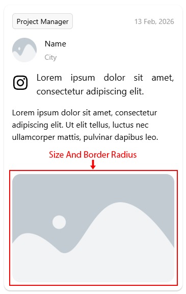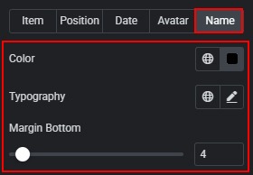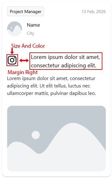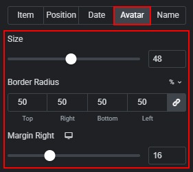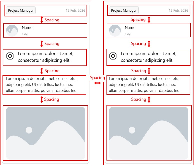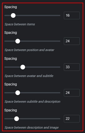 - Between items. Between position and avatar. Between avatar and subtitle. Between subtitle and description. Between description and image.
