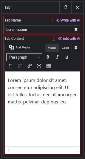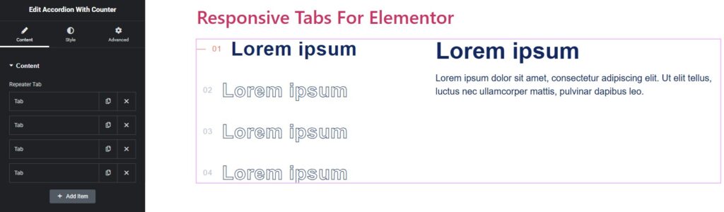 To add a new tab to the widget, click the widget on the page, go to the Content tab, and click the Add Item button.