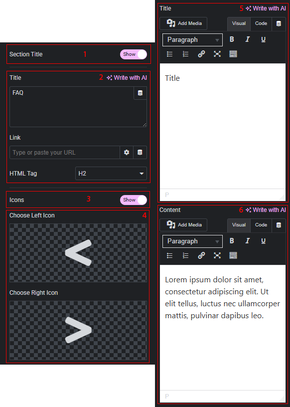 - If the section title display is enabled, you can edit the title text, add links, and change the HTML tag.