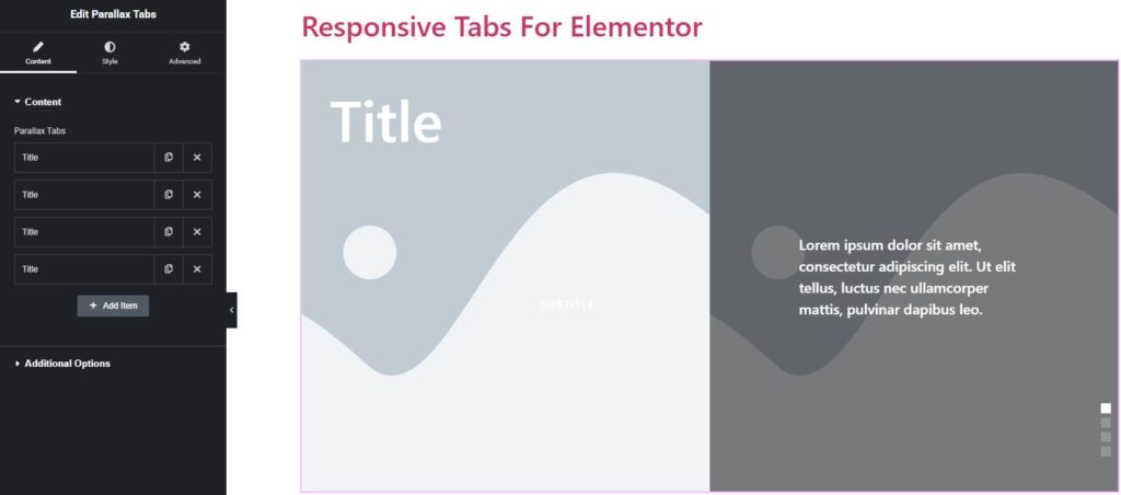 To add a new tab to the widget, click the widget on the page, go to the Content tab, and click the Add Item button.