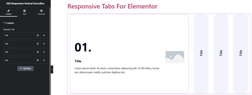 To add a new tab to the widget, click the widget on the page, go to the Content tab, and click the Add Item button.