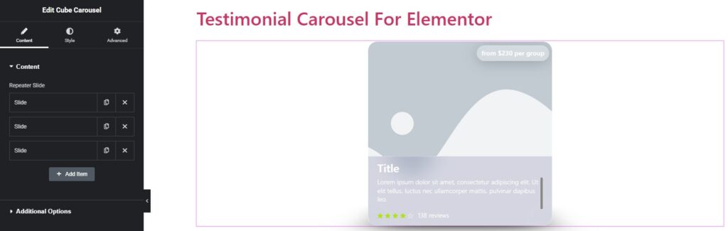 To add new reviews to the widget, click the widget on the page, go to the Content tab, and click the Add Item button.