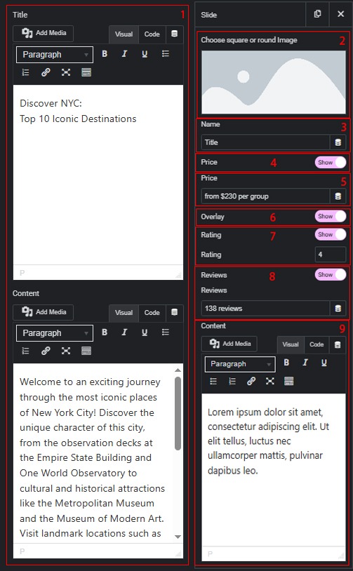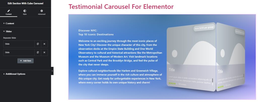 To add new reviews to the widget, click the widget on the page, go to the Content tab, and click the Add Item button.