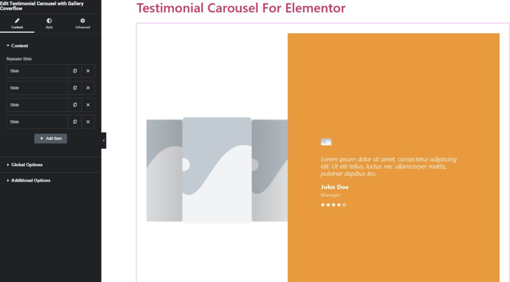 To add new reviews to the widget, click the widget on the page, go to the Content tab, and click the Add Item button.