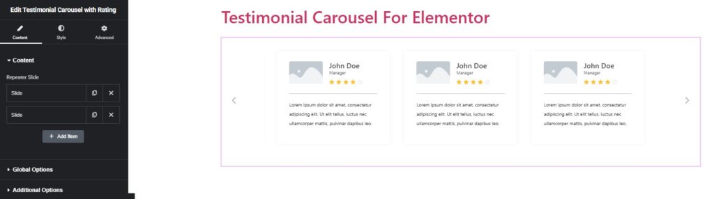 To add new reviews to the widget, click the widget on the page, go to the Content tab, and click the Add Item button.